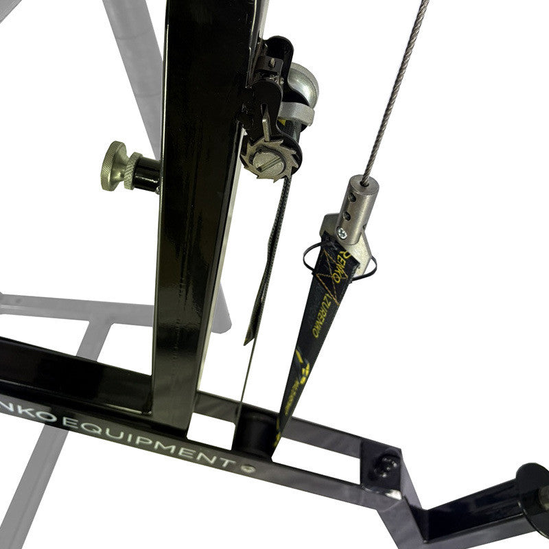 Load transmission: 1:1 using a swivel pulley, steel cable, and adjustable strap