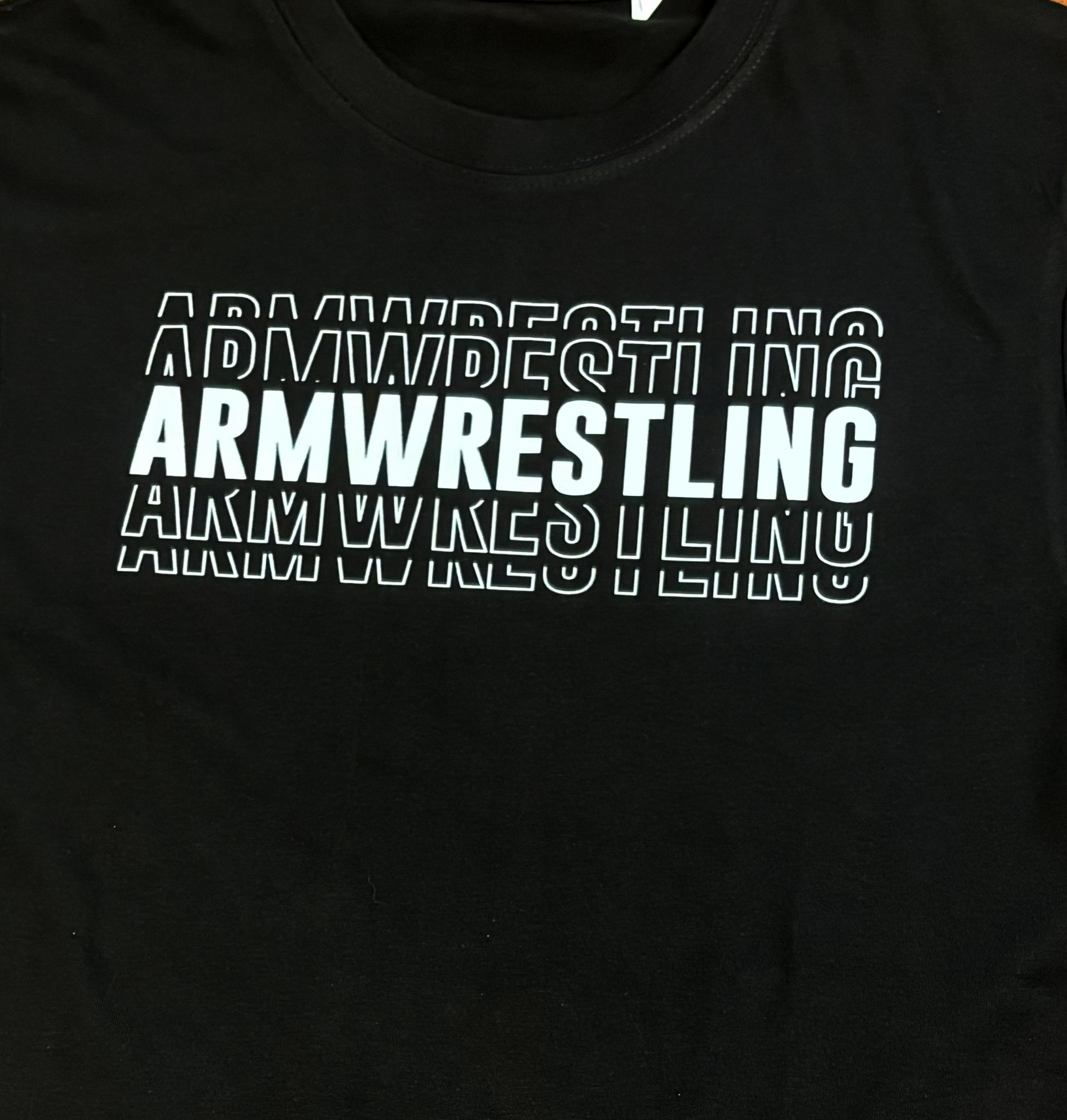 Clean, powerful armwrestling look for everyday wear. Deep black tee with a repeated ARMWRESTLING wordmark across the chest (center line bolder for contrast). Athletic cut that frames the shoulders and chest. Plain back with no graphics. Ribbed crew neck and reinforced seams for long-term comfort.