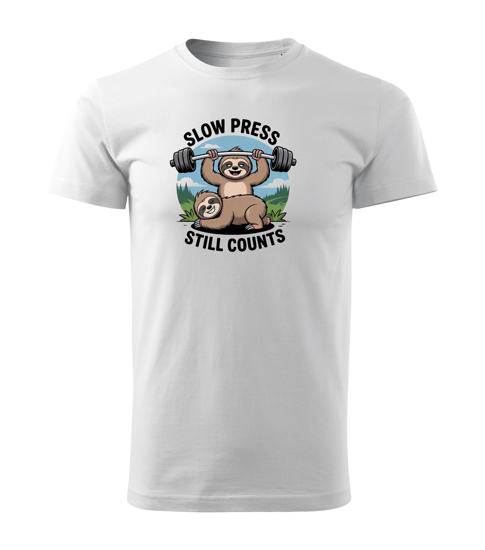 White cotton tee with a fun lifting vibe. Front graphic shows two smiling sloths—one pressing a barbell—framed by the arched slogan “SLOW PRESS STILL COUNTS.” Regular athletic fit that sits well on the shoulders and chest. Ribbed crew neck, soft handfeel, and reinforced seams for everyday comfort. Plain back with no graphics. Durable front print that keeps its shape and color after many washes.